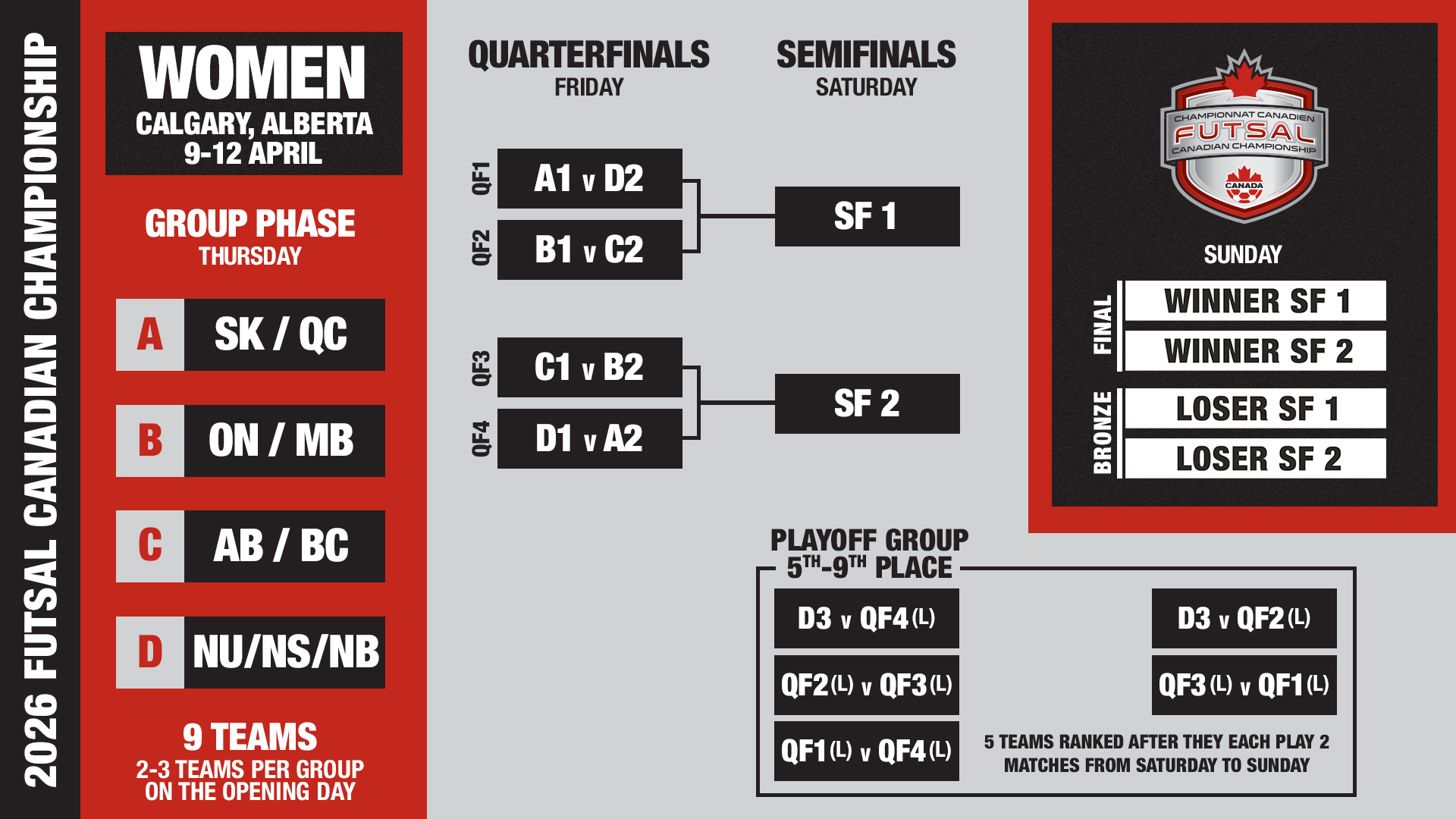 The 2026 Futsal Canadian Championship will bring together qualified teams from 8-12 April with all matches to be played at the Seven Chiefs Sportsplex in Tsuut'ina Nation, the same location where the competition was held in 2023 and 2024 after the women’s division was introduced three years ago.