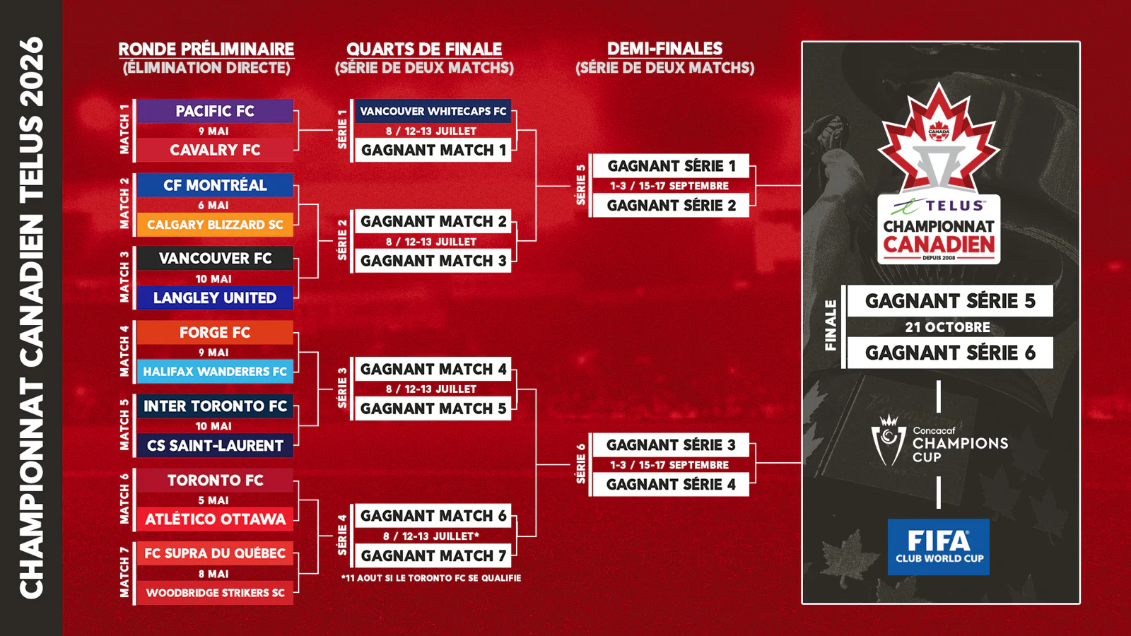 Le Championnat canadien TELUS de Canada Soccer est la grande compétition nationale éliminatoire qui rassemble des clubs de tout le pays pour disputer la Coupe des Voyageurs. Le Championnat canadien TELUS masculin 2026 réunit 15 clubs qualifiés de la Major League Soccer, de la Première Ligue Canadienne et des Premières Ligues de soccer du Canada afin de déterminer la meilleure équipe du Canada lors de la Bataille du Nord. Les gagnants du Championnat canadien TELUS se qualifient pour la compétition internationale annuelle, la Coupe des Champions de la Concacaf, qui mène à la Coupe du Monde des Clubs de la FIFA.