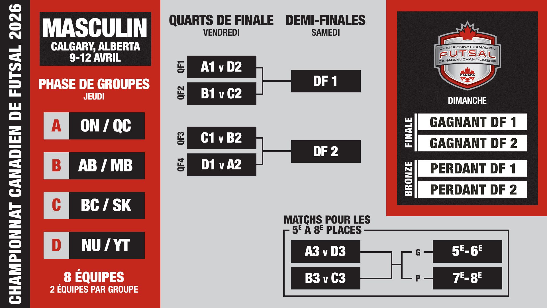 Le Championnat canadien de futsal 2026 rassemble des équipes qualifiées du 8 au 12 avril prochain, et tous les matchs se joueront au Seven Chiefs Sportsplex dans la Nation Tsuut’ina, soit le même endroit où la compétition a eu lieu en 2023 et en 2024 suite à l’introduction de la division féminine il y a trois ans.