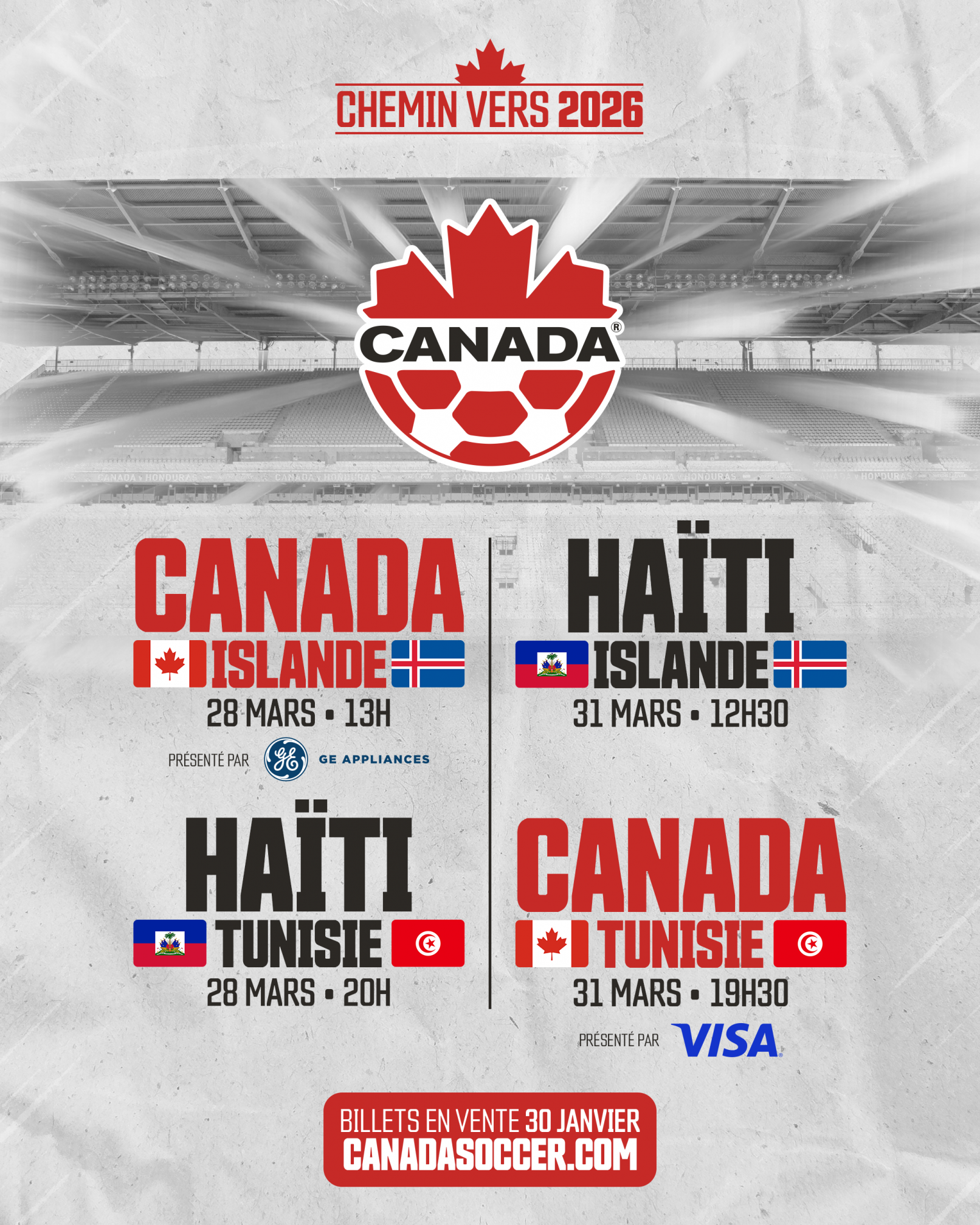 Les billets pour les matchs du CANMNT c. l’Islande et du CANMNT c. la Tunisie seront mis en vente au grand public le 30 janvier via Ticketmaster.ca, suivant une série de fenêtres de préventes anticipées pour les membres CanadaROUGE.