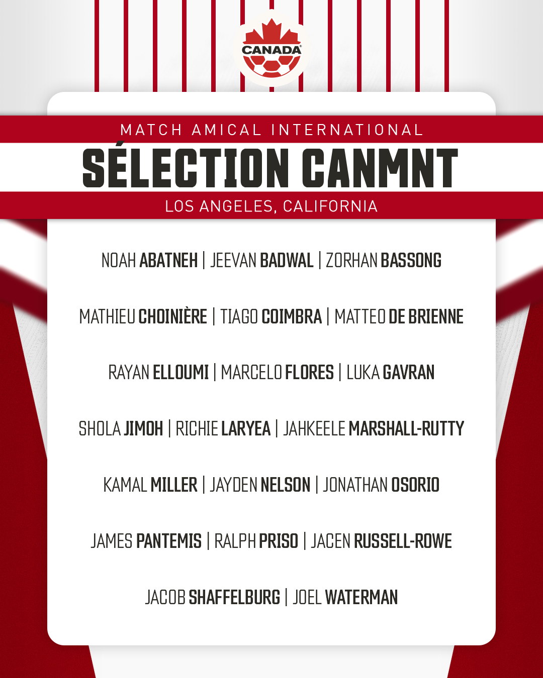 Les milieux de terrain qui rejoignent le groupe sont : Jeevan Badwal du Whitecaps FC de Vancouver, Mathieu Choinière du Los Angeles FC, Jayden Nelson de l’Austin FC, Marcelo Flores des Tigres UNAL, Shola Jimoh de l’Inter Toronto FC, Jonathan Osorio du Toronto FC et Jacob Shaffelburg du Los Angeles FC.
