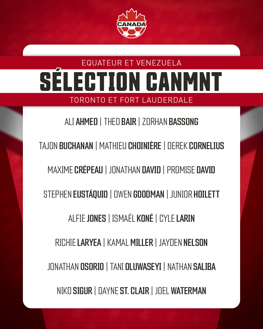 Le reste de la sélection comprendra les attaquants suivants : Theo Bair du Lausanne-Sport (prêté par l’AJ Auxerre), Jonathan David de la Juventus FC, Promise David du Royale Union Saint-Gilloise, Cyle Larin du Feyenoord (prêté par le RCD Mallorca) et Tani Oluwaseyi du Villarreal CF.