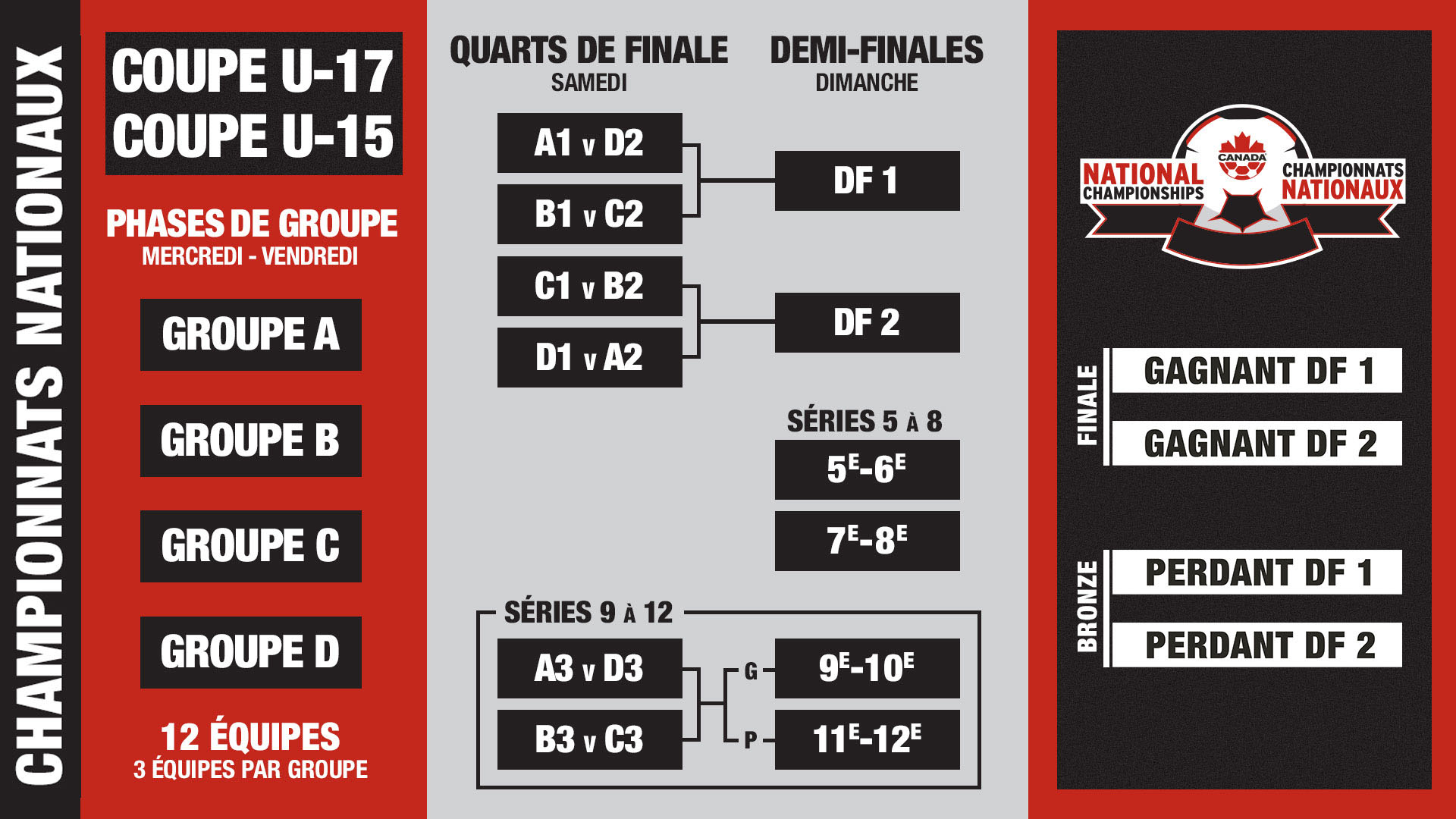 Sport le plus accessible au Canada, le soccer compte plus de 750 000 joueurs inscrits à travers le pays. Au cours de la dernière année seulement, 580 équipes juvéniles ont participé aux qualifications pour les Championnats nationaux dans les catégories U-17 et U-15, tant chez les garçons que chez les filles. Parmi ce groupe, 12 équipes juvéniles se sont qualifiées dans chacune des quatre divisions, chaque site hôte accueillant 24 équipes qualifiées tout au long de l’événement d’une semaine menant à la finale canadienne le lundi de l’Action de grâce.