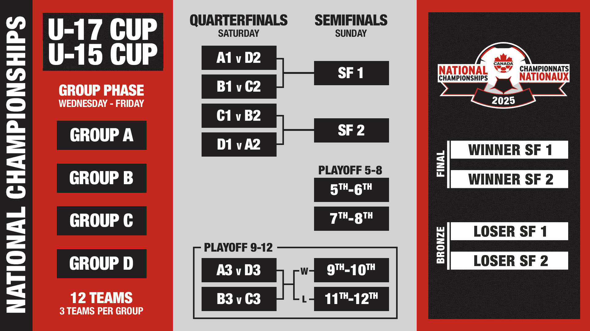 As part of the Youth Competitions Network, an enhanced schedule for the Youth National Championships was introduced in 2025 whereby each division now features 12 qualified teams. Group matches are played Wednesday through Friday followed by knockout and playoff matches from Saturday through Monday. Each host welcomes the qualified teams to their community with a unique Opening Ceremony, friendly volunteers at each of the competition venues, transportation to and from the team hotels, and a Finals Day atmosphere whereby all teams are in attendance for the Canadian Finals.