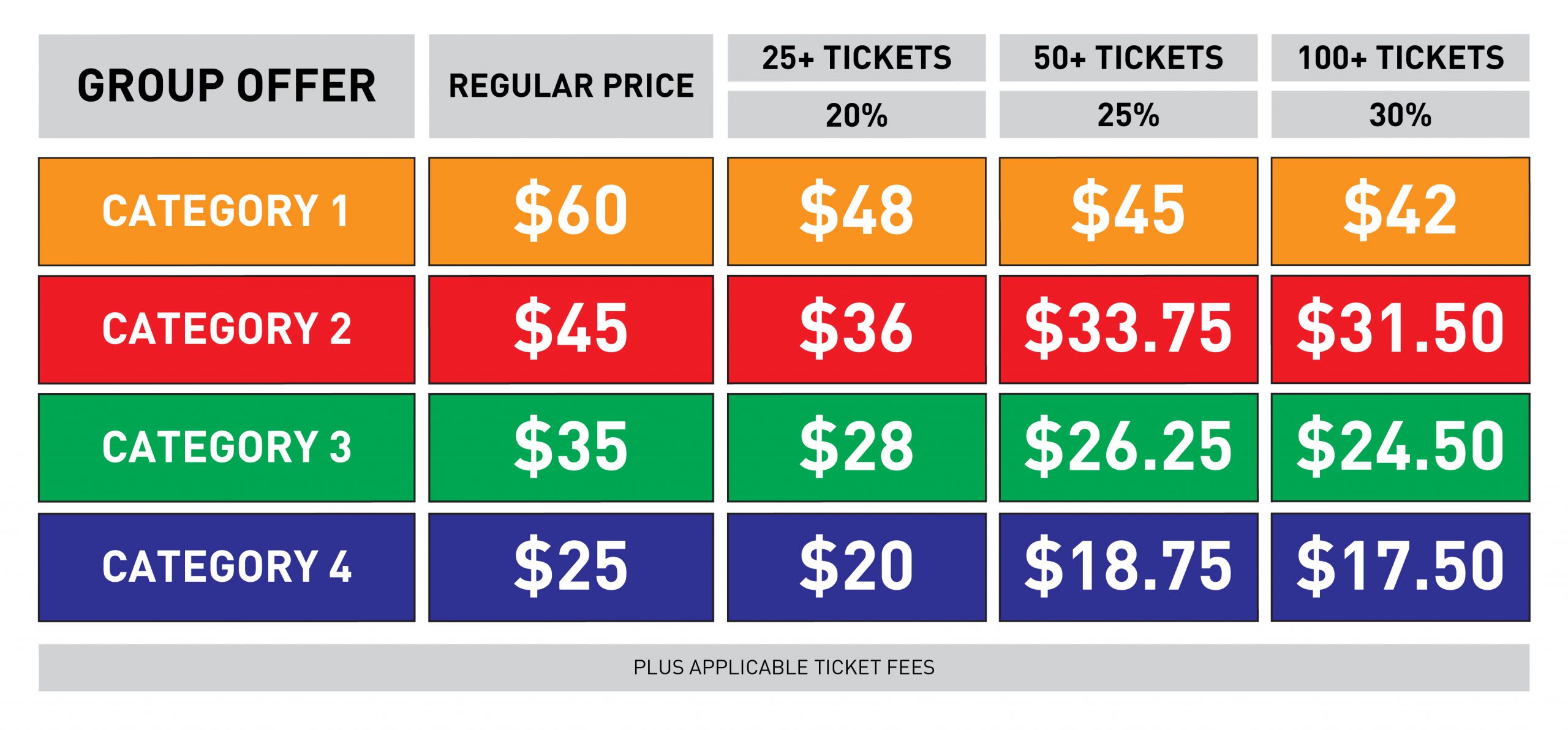 To submit your request, complete the group order form indicating the price point and quantity of tickets you are wishing to purchase. Following the submission of the online form you will be contacted directly to confirm payment details and complete the processing of tickets. Ticket orders will be processed on a first come, first serve basis so organize your group, club, or team today