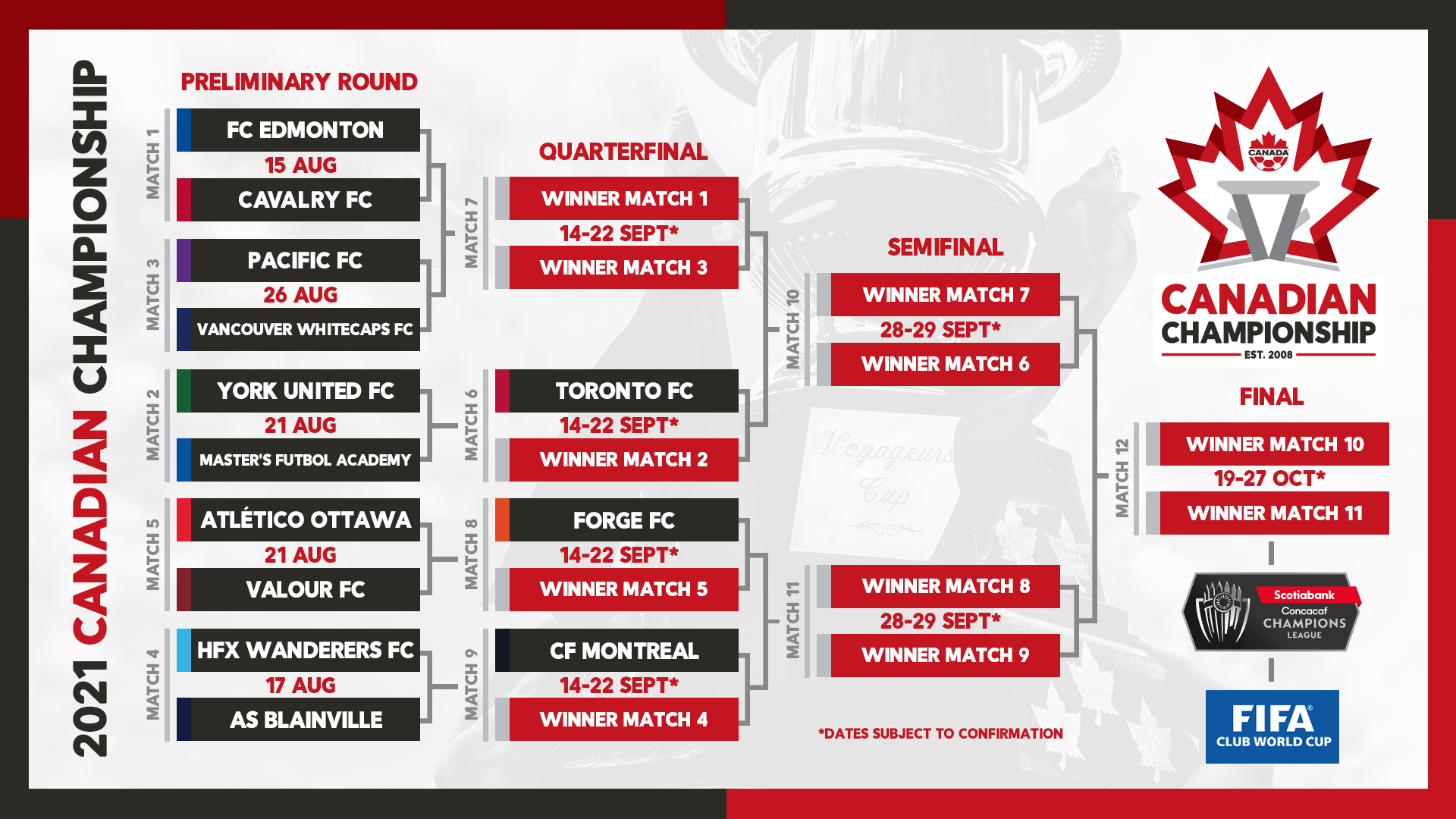 “We are excited to see the return of the Canadian Championship in 2021 with an updated brand identity and the return of the 13-team format that makes the competition truly and uniquely Canadian,” said Dr. Nick Bontis, Canada Soccer’s President. “As we turn the corner on the COVID-19 pandemic, we look forward to returning to stadiums filled with fans cheering their clubs on in pursuit of a chance to play in the Concacaf Champions League and FIFA Club World Cup competitions.